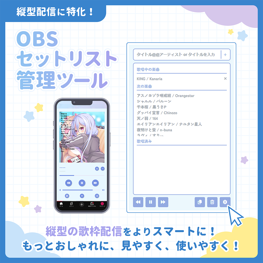 歌枠・縦型配信向け!セットリスト管理ツール / スマホ音楽プレーヤー風 Music Player List